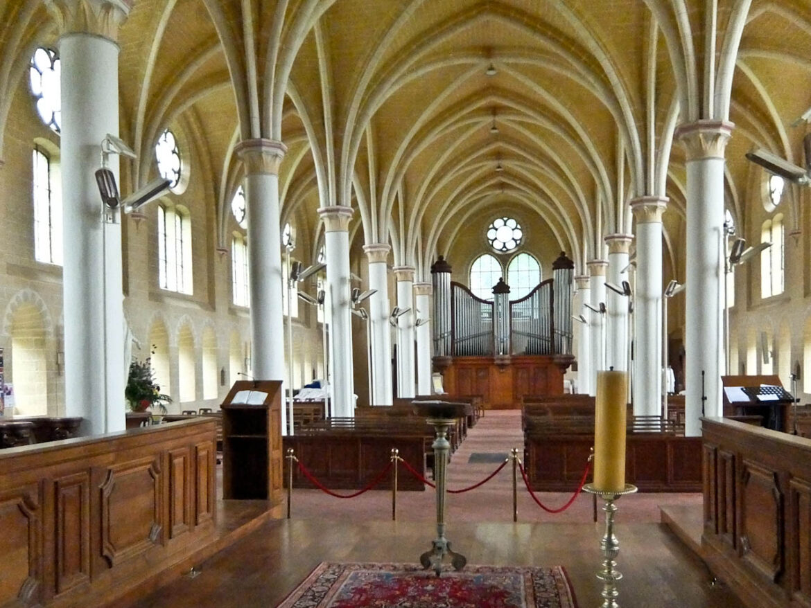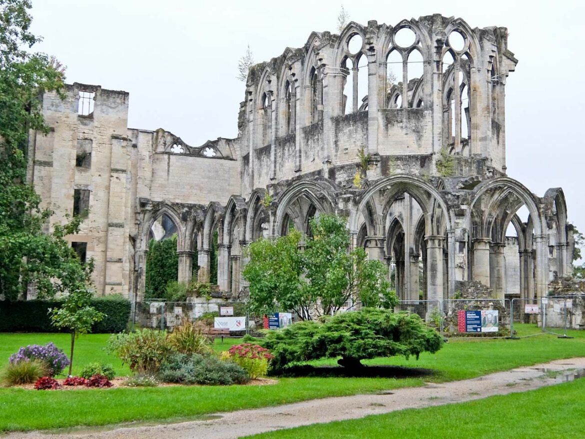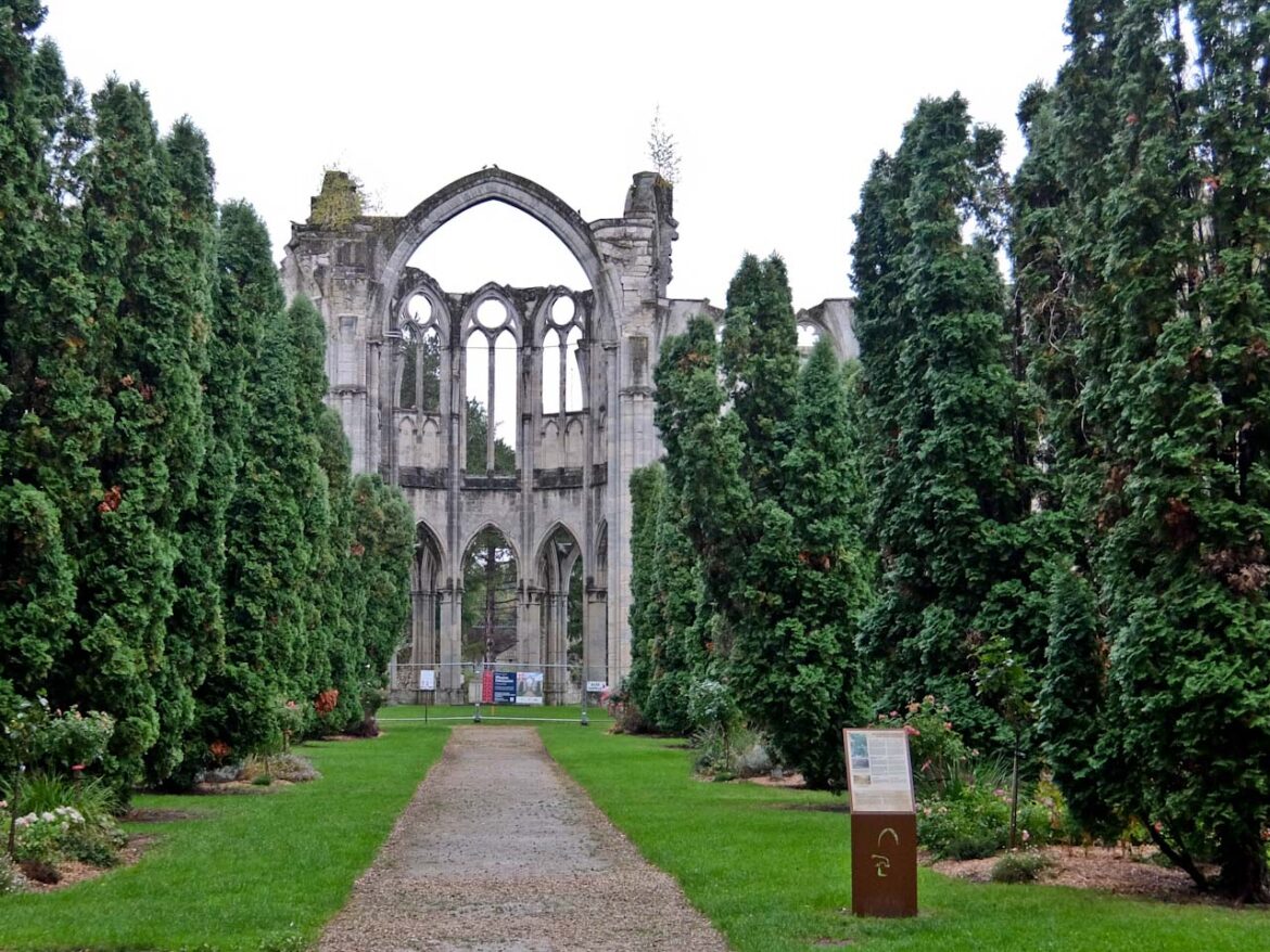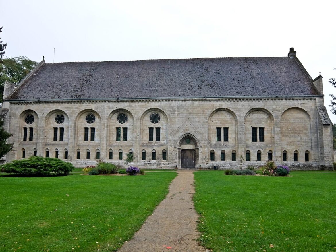 The forecast is not good and I set off in pouring rain along the Oise towpath towards the Chiry-Ourscamp Cistercian abbey. There’s a community of around 30 monks here and I’m met by the abbot who shelters me with his umbrella as he shows me around the ruins. He’s particularly proud of the restored chapel in what was once the infirmary built in 1220.